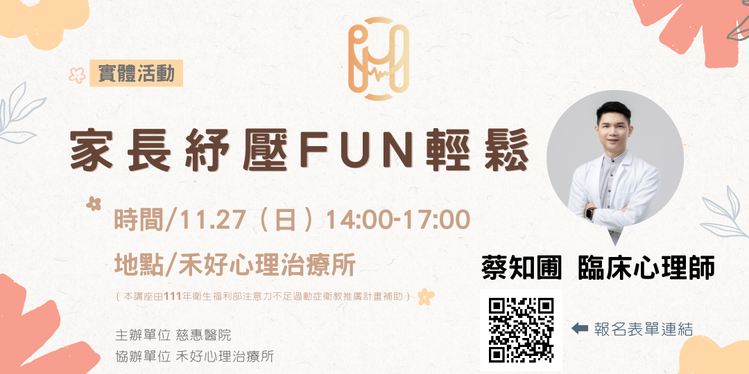 ※活動報名細節 活動時間:11/27(日)14:00-17:00 活動講師:蔡知圃(臨床心理師) 活動上限人數:15人 活動形式:實體體驗(地點:禾好心理治療所) 活動參與對象:家長(孩子年齡不拘) ※報名須知 1. 名額限制: 為維護活動品質,本活動限額15人,若報名人數超過上限,將以填寫表單時間依序安排名額。 2. 取消報名:因本次團體為免費活動,在完成報名後,若當日不克前來,請盡量在活動三天前來信或來電告知,以利禾好後續將您的名額安排給其他想參與的民眾。 -